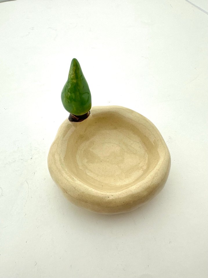 Hafif yeşil detaylı, yuvarlak ve pürüzsüz tabanlı seramik mumluk. Pazarlık payı vardır.