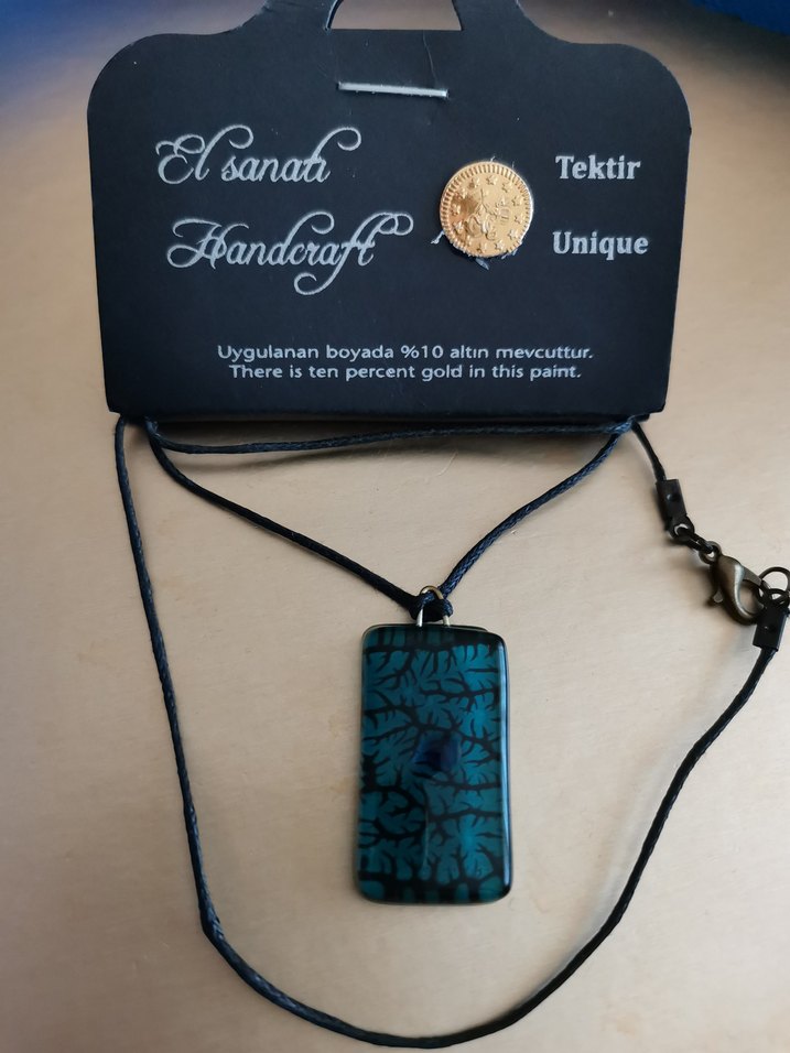 El yapımı kolye, koyu turkuaz renkli. Boyasında yüzde on altın bulunur, benzersiz bir dokunuş sağlar. ✨