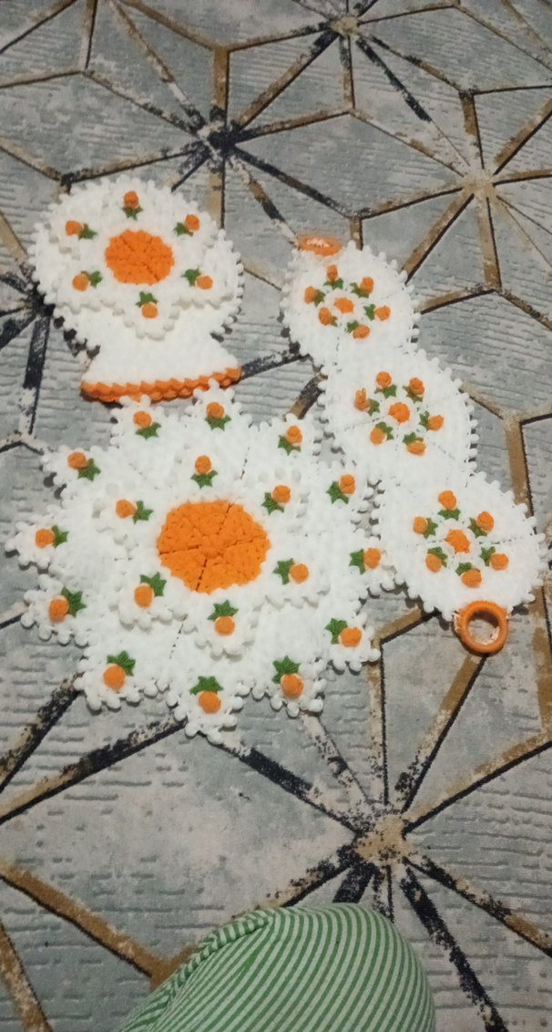Turuncu ve beyaz çiçek desenlerine sahip el yapımı örgü set, yuvarlak parça, eldiven ve dikdörtgen paspas içerir.