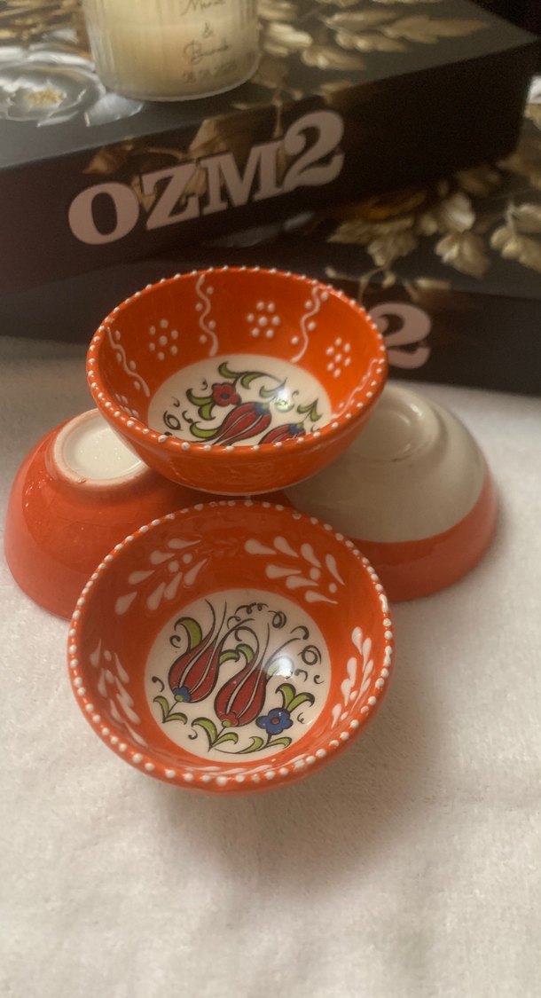 El yapımı turuncu seramik kaseler, geleneksel çiçek desenleri ve "OZM2" yazısı ile süslenmiştir.