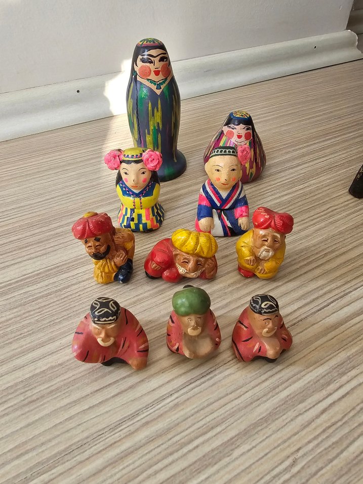 Özbek vintage minyatür figür setleri. Çeşitli canlı renklere sahip geleneksel tasarımlı renkli el yapımı minyatür koleksiyonluk biblolar. Her parça benzersiz kültürel detaylar içerir. Fiyat için yorumlardan iletişime geçebilirsiniz. Canlı detaylara ve ifadelere sahip, çeşitli geleneksel tasarımlarda el yapımı renkli figürinler seti.