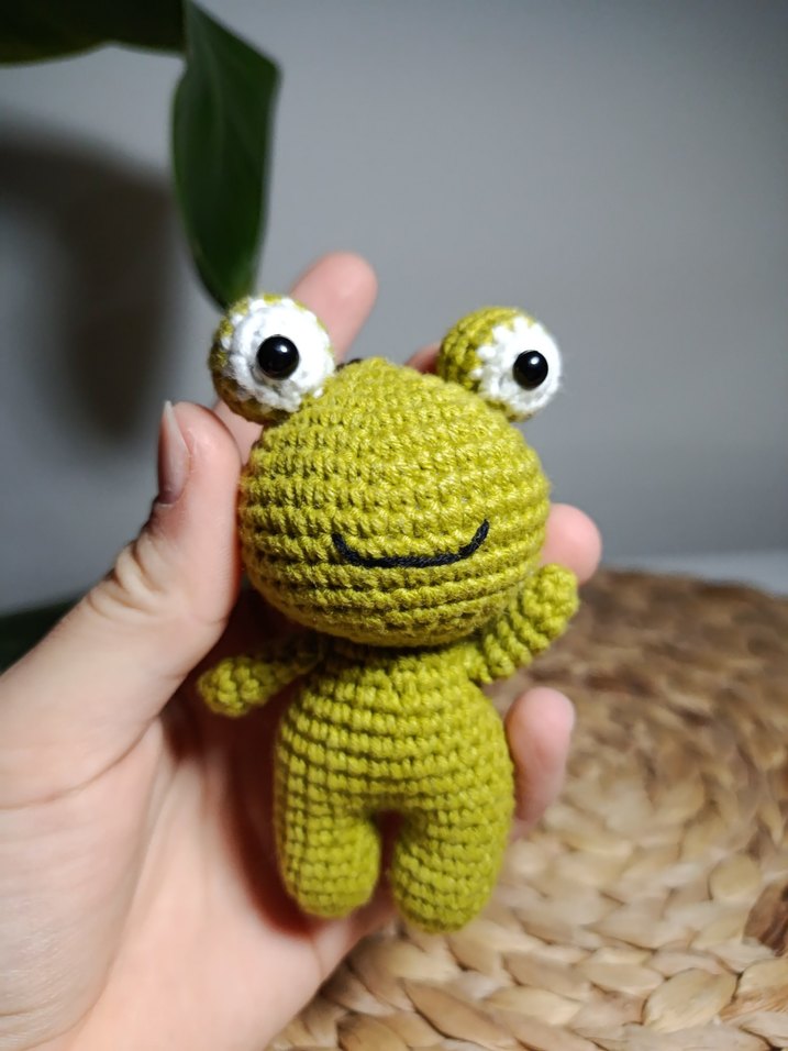 Büyük gözlü ve basit bir gülümsemeye sahip, yumuşak iplikten el yapımı renkli yeşil kurbağa anahtarlık.
