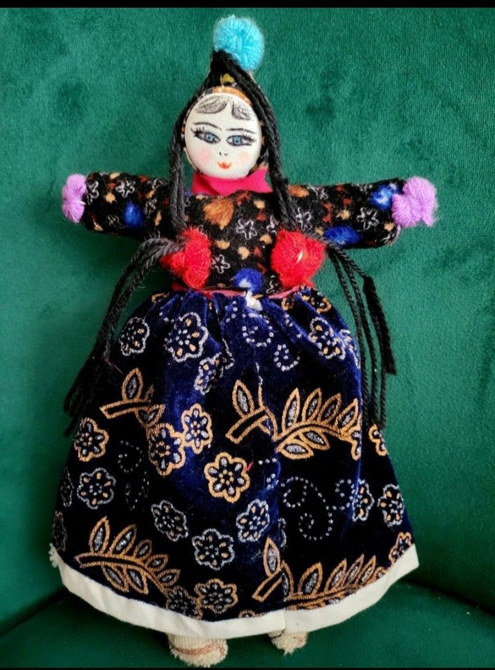 Çiçek desenli renkli elbise giymiş, örgülü saçlı, detaylı yüz işçiliğine sahip koyu renkli bebek. Renkli ponpon süslemeleri bulunur.