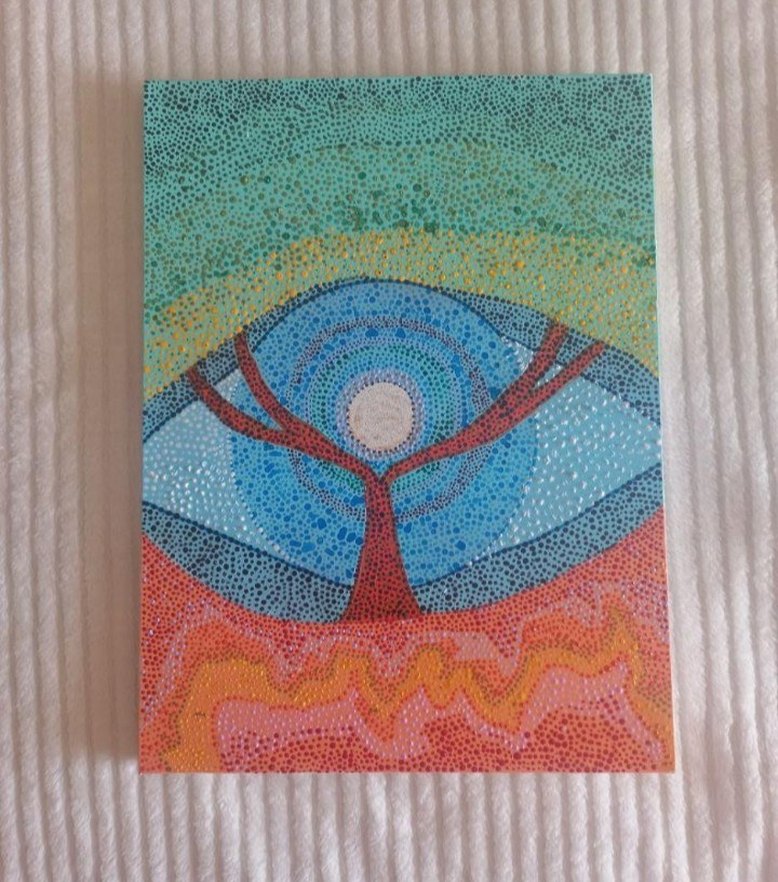 Bu tablo, göz ve agac figürünü andıran çok renkli nokta desenleriyle soyut bir tasarıma sahiptir. Renkleri açık ve canlıdır. el yaptığım 1 hafta çalıştım 30x40cm