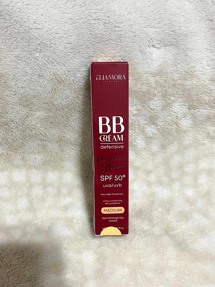Elamora parlak bordo renkli BB krem, SPF 50+ koruma ile orta ton kapatıcılık sağlar. Dermatolojik olarak test edilmiştir.