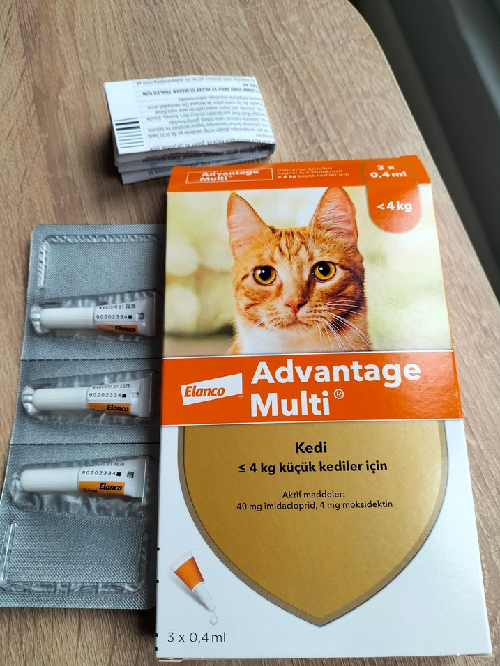 Elanco Advantage Multi, 4 kg altındaki kediler için 40 mg imidakloprid ve 4 mg moksidektin içerir. 3 adet 0.4 ml dozluk ambalajda.