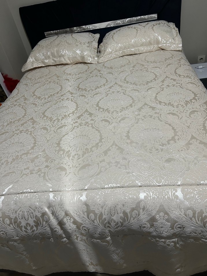Parlak bej kumaş üzerine işlenmiş detaylı desenlere sahip yatak örtüsü, aynı işlemeli kılıflarla birlikte gelir. ️