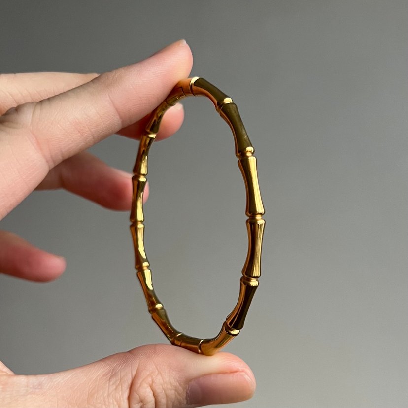 Parlak altın renginde, elastik bantlı bambu esintili tasarıma sahip bileklik. Minimalist ve bohem tarzlar için uygundur. ✨