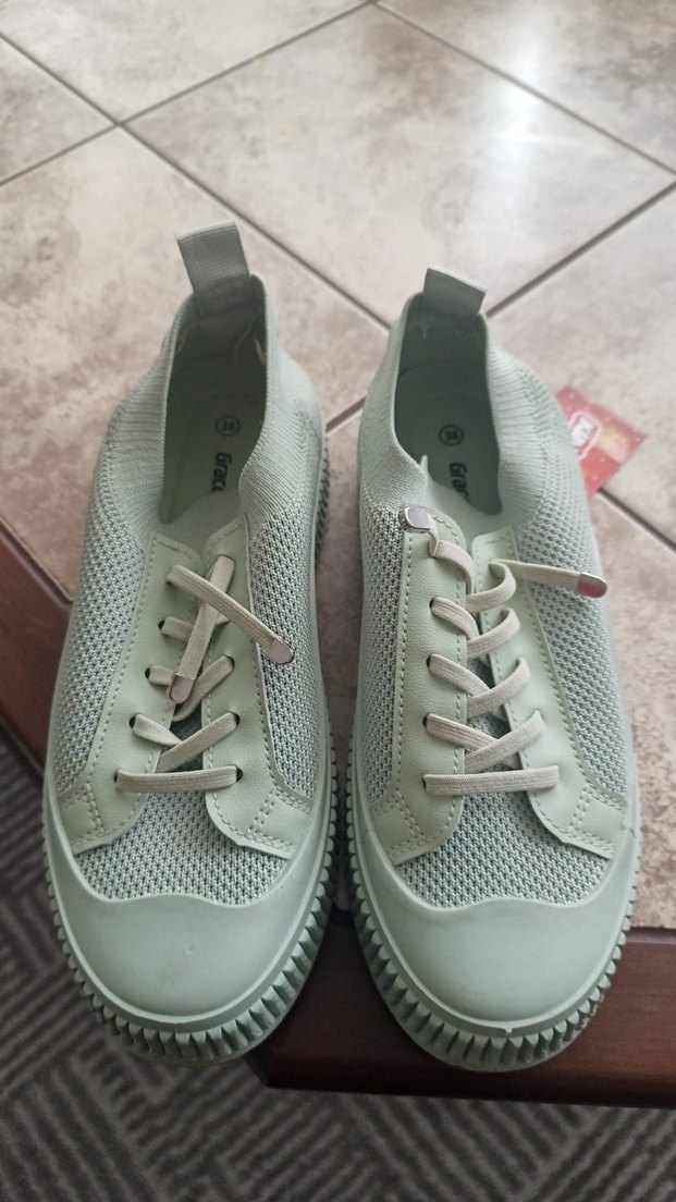 Nefes alabilen elastik file kumaşlı, blok topuklu beyaz kadın spor ayakkabısı. Rahat ve trend tasarım. Bir kez giyildi büyük olduğu için kullanılmadı
