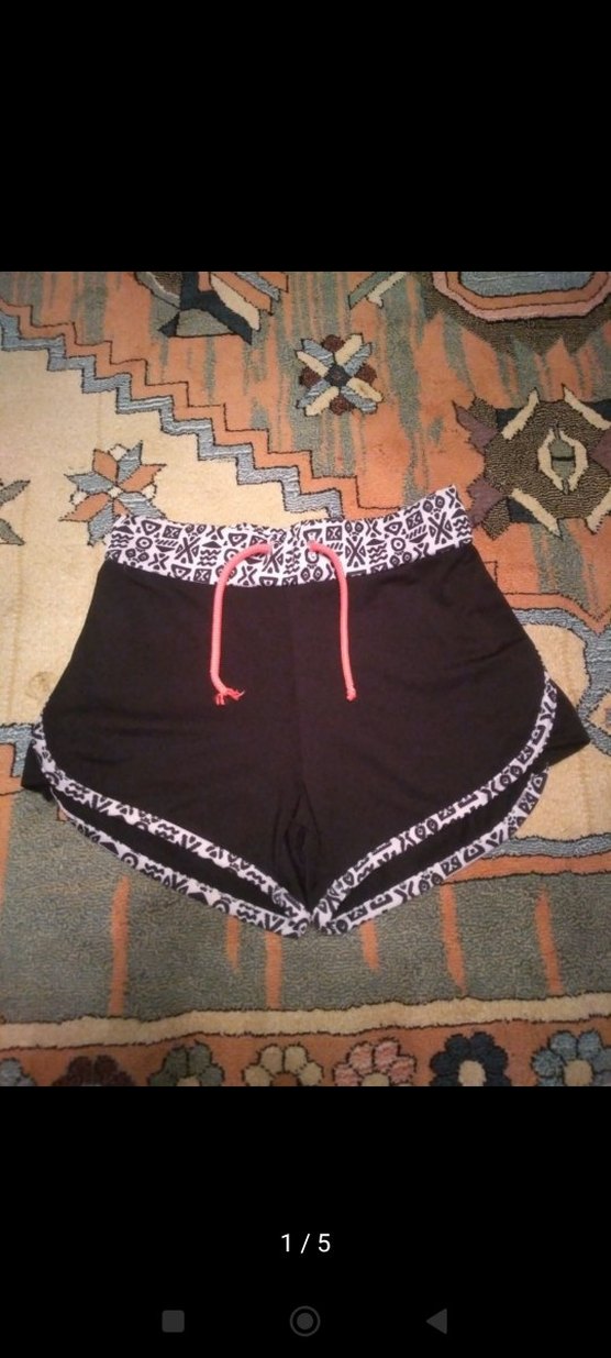 Baskılı detaylı, elastik bel ve canlı ip bağlamalı siyah mini şort, az kullanılmış hiçbir deformasyon yoktur