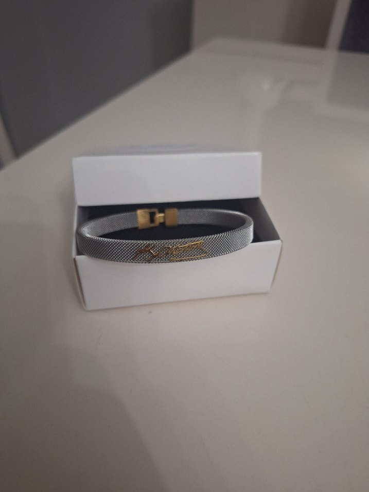 Kemal Atatürk imzali gri elastik bant ve hafif baskılı desene sahip çağdaş erkek bilekliği, romantik akşamlar için minimalist ve rahat bir seçenektir.