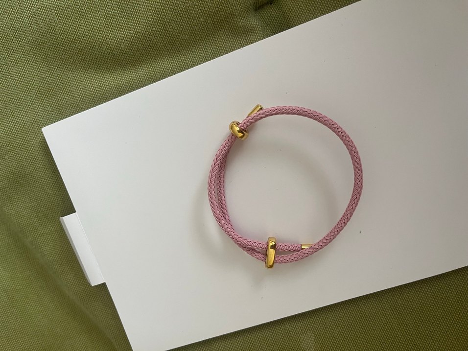 Pastel pembe elastik bant ve yılan deseniyle sade kadın bileklik, altın renkli küçük detaylarla günlük sokak stiline uygun.