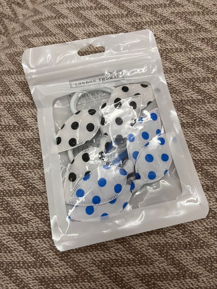 Elastik yapıda, beyaz zemin üzerinde mavi ve siyah puantiyeli çocuk saç tokası seti, sokak modasına uygun şık tasarım.2 mavi 2 siyah.