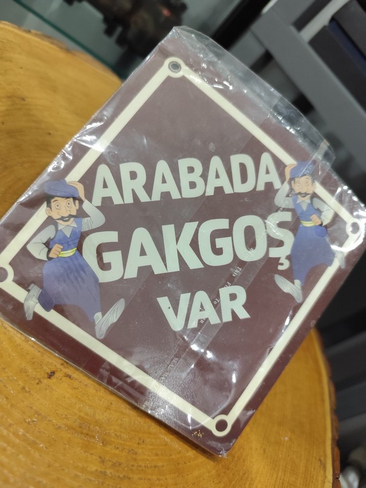 Kahverengi vintage tarzda erkek rozeti, çizgi karakterler ve "ARABADA GAKGOS VAR" yazısıyla sade sokak giyimi tarzında.