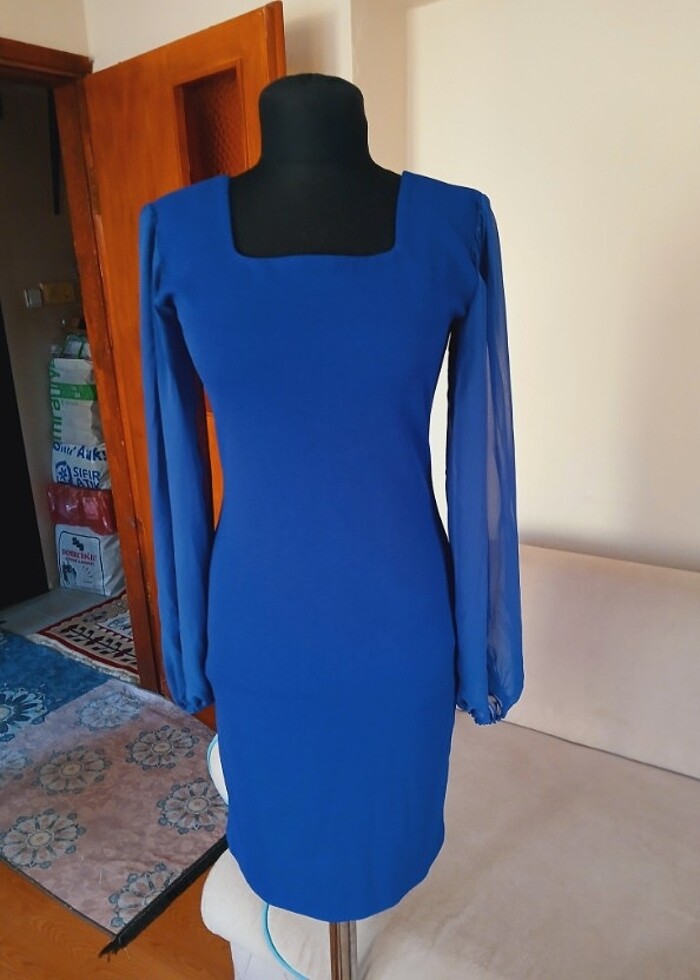 Özel dikimdir etiketi yoktur .36 38 beden uyumlu,likralıdır esnemesi vardır.kollardan tüllüdür.özel günlerde giyebilecek elbisedir.engi parlament mavisidir.