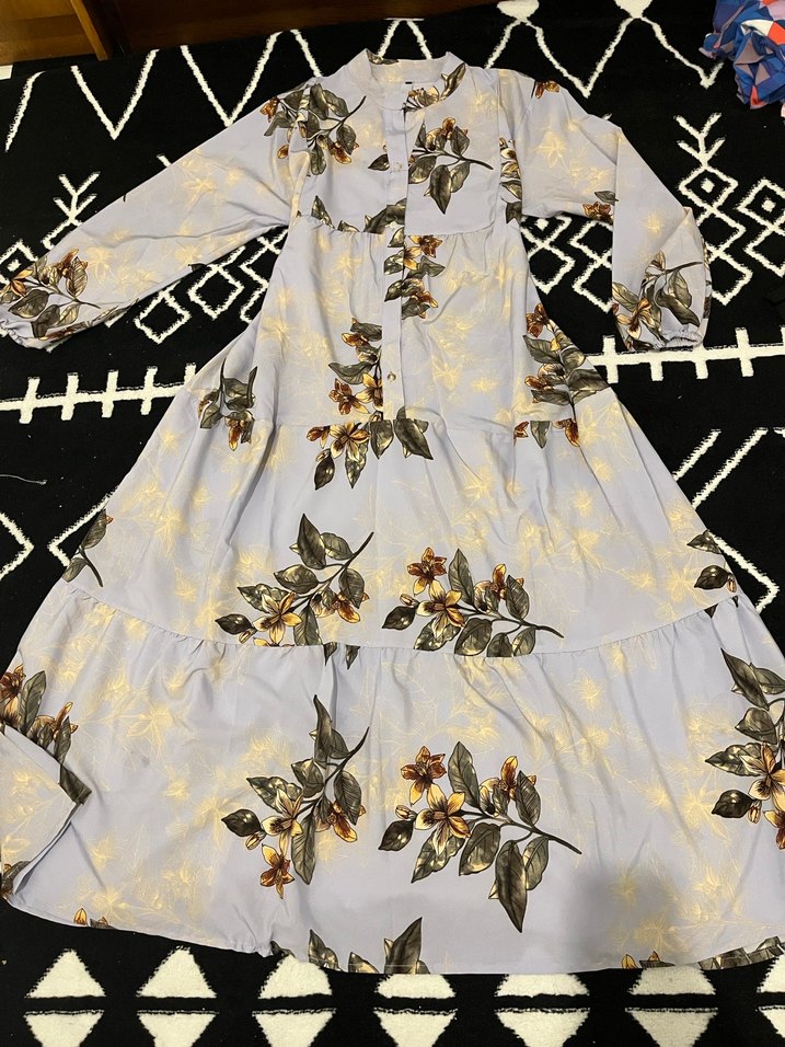 Uzun, beyaz renkli bu elbise, çiçek desenleri ve fırfır detaylarıyla bol kesimdir. Uzun kollu ve V yakalı, yumuşak sentetik kumaştan yapılmıştır.