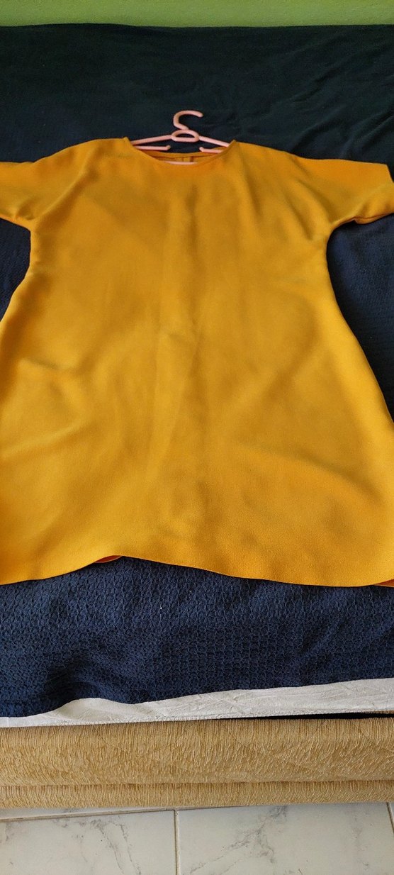 Sarı renkte, yuvarlak yakalı, kısa kollu ve drapeli tasarıma sahip günlük elbise