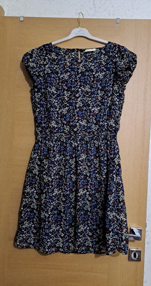 Kısa kollu, pilili tasarıma sahip bohem tarzda midi elbise. Rahat ve hareketli, koyu renkli çok renkli çiçek desenli.