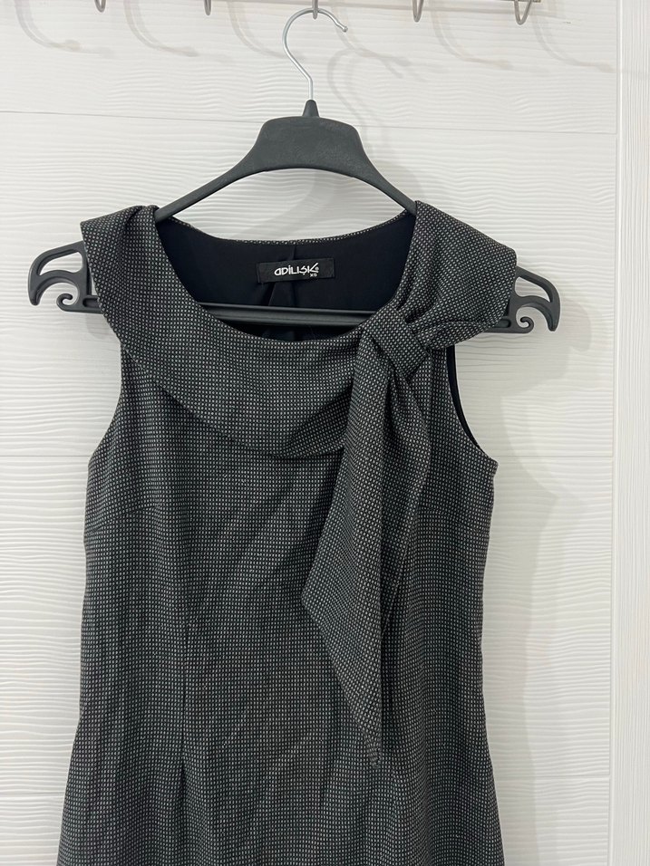 Drapeli, kolsuz, uzun ve fitted kesime sahip bu gri elbise, halter yaka ve ince desenli yapısıyla ofis için uygundur.