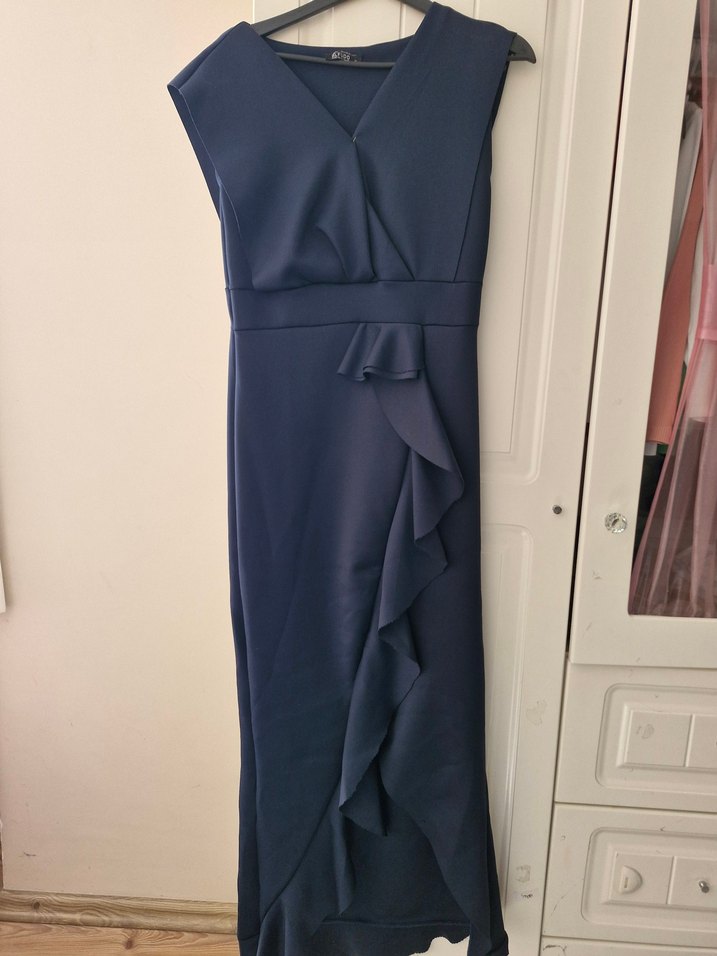 Lacivert, kolsuz, v yaka ve fit kesim uzun gece elbisesi. Fırfır detayıyla modern klasik tarz sunar. Ofis için uygun. 1 kere giyildi sorunu yoktur