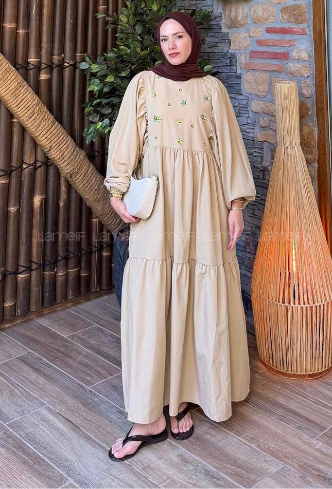 Bej renkli, uzun kol ve drapeli kesime sahip bu elbise, nakış detayları ve yuvarlak yaka ile bohem tarzını yansıtıyor. Keten kumaştan üretilmiştir. hiç bi kusuru yoktur.