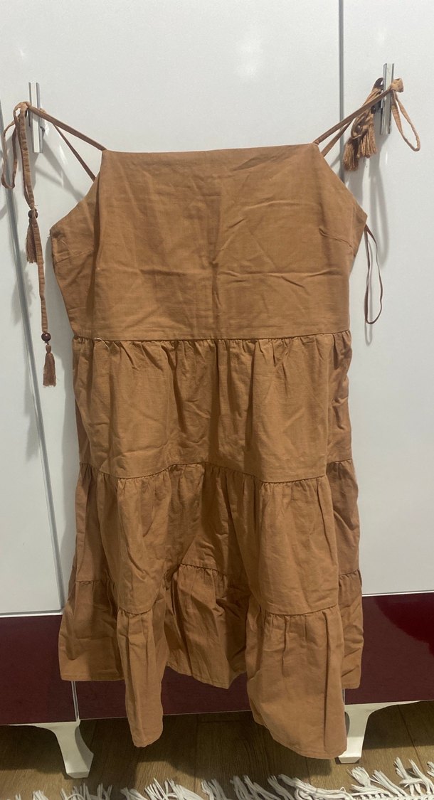 Kahverengi keten elbise, askılı. 1 kere giyildi hiçbir lekesi vs yok