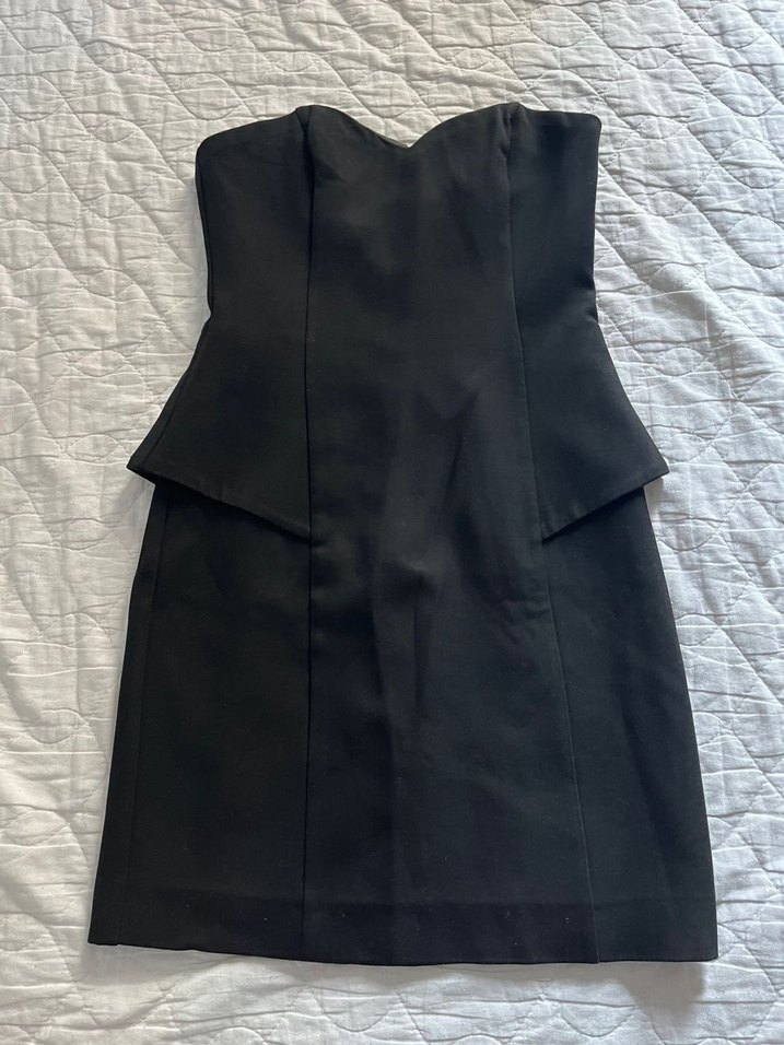 Orjinal Mango marka siyah straplez midi elbise, sırtı fermuarlı , vücuda oturan kesimi ve drapeli detaylarıyla klasik tarz kullanıma uygun.