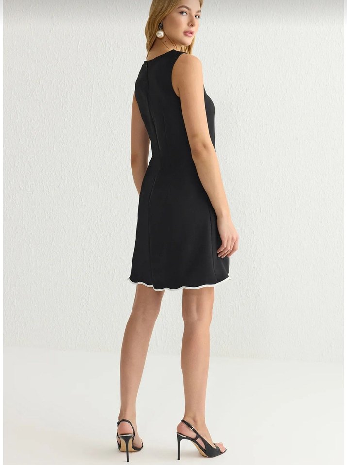 Bisiklet yakalı, kolsuz, siyah mini elbise, hafif fırfır detaylı ve vücuda oturan kesimde. Pürüzsüz sentetik kumaştan, ofis için uygun.