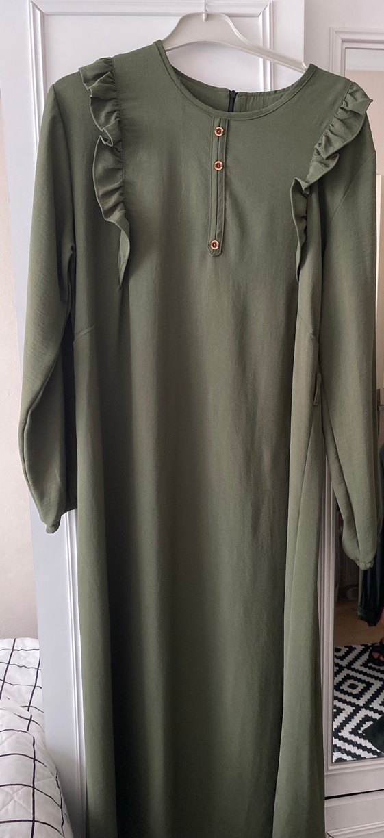 Salaş kesimli, fırfırlı detaylı, uzun kollu keten kumaştan yapılmış haki renk uzun elbise. Yüksek yakalı ve minimalist tarzda, günlük kullanıma uygundur.