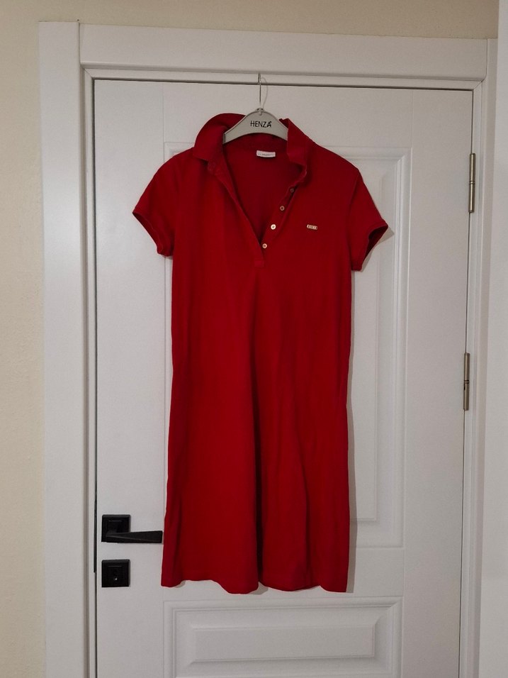 Kısa kollu, düğmeli, yakalı kırmızı mini ellbise. Günlük sokak stili için uygun, vücuda oturan kesime sahip. Yakasındaki amblemi düştü onun dışında sorunu yok