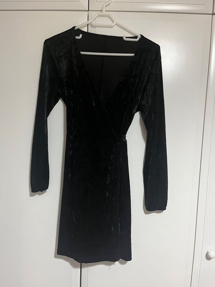Siyah, uzun kollu, ince kadife kumaş, bel arkasından bağlamalı, V yakalı ve kruvaze tasarıma sahip, çan model midi elbise. Özel günler için uygundur.
