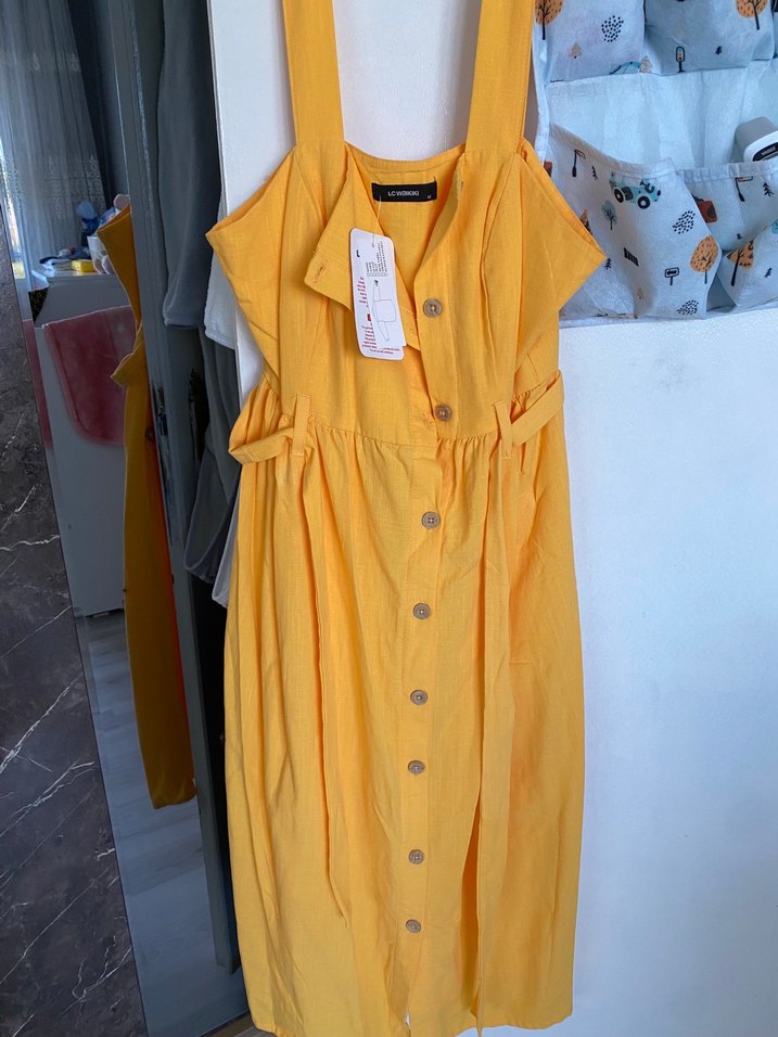 Aldım hiç giymedim etiketli sarı diz altı sarı elbise