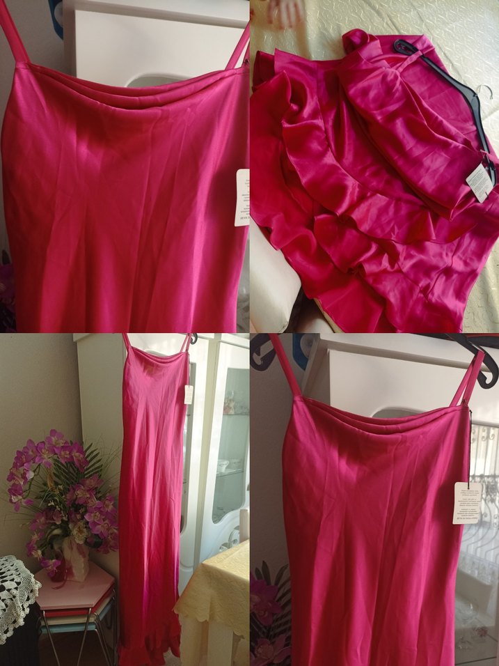 Parlak pembe kumaşla uzun, ince askılı ve kolsuz tasarıma sahip, düz renkli bohem Paris tarzı elbise. beden 36.38