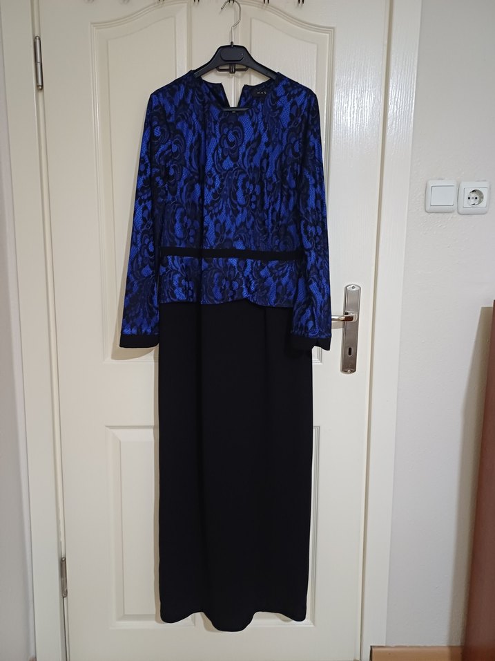 Uzun kollu, mavi ve siyah desenli, regular fit gece elbisesi. Kemer detaylı, mütevazı gotik tarzda, ofis için uygun. 1.65 boy 80 kilo annemin ölçüleri bu ebatlarda ki kişilere uygundur.