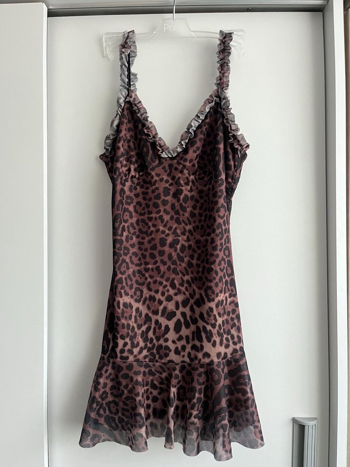 Kadınlar için leopar desenli, uzun kesim ve V yaka fırfırlı detaylara sahip içinde astarı bulunan elbise günlük kullanım için uygundur. Leopar Desenli V Yaka Fırfırlı elbise