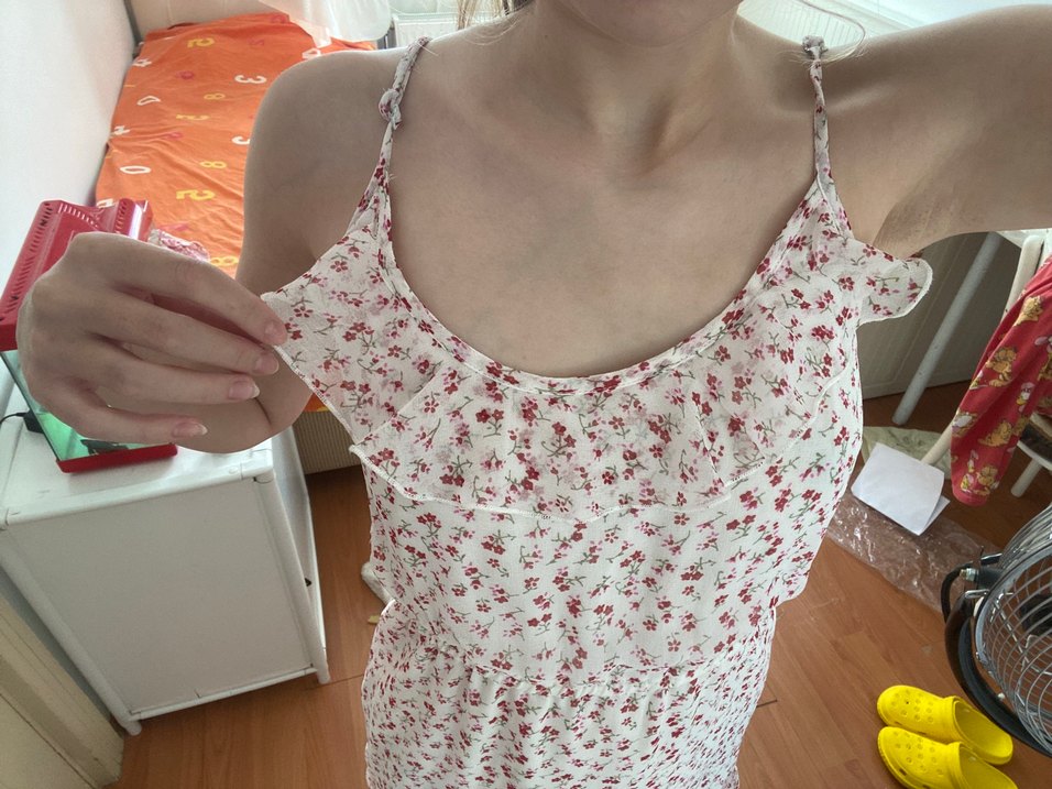 Askılı, çiçek desenli, hamile ve emzirme geceliği. Diz boyu, vücuda oturan kesim ve fırfırlı detay içerir. bir kaç kez giyildi hiç defosu yok.