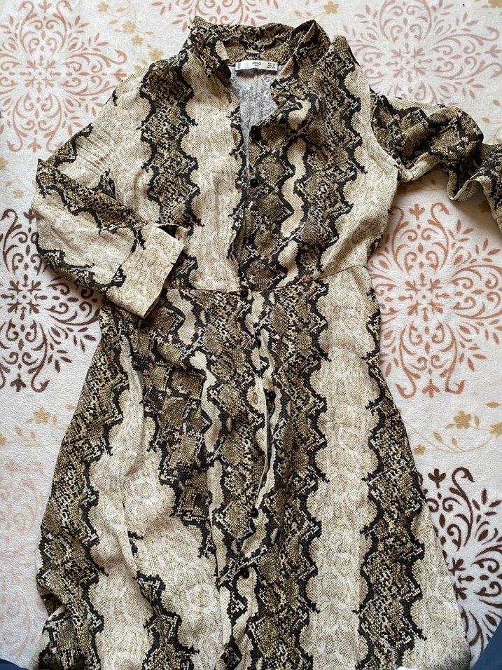 Yılan desenli, kahverengi ve gri renkli yakalı ve düğmeli elbise