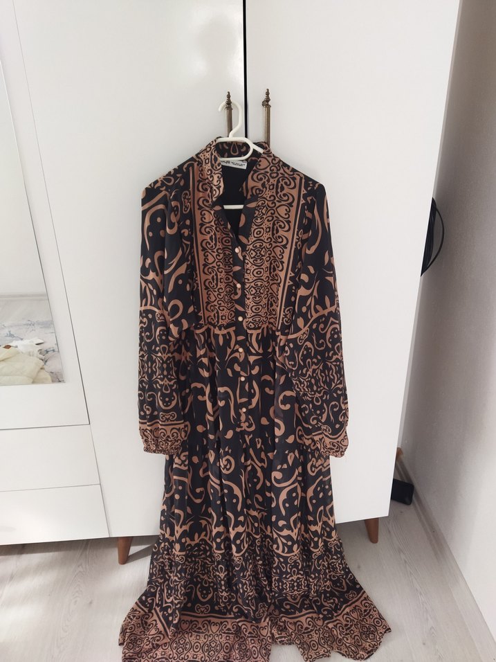 Desenli, koyu tonlarda camel renkli yoga askısı, yoga sırasında güvenli ve rahat kullanım sağlar.