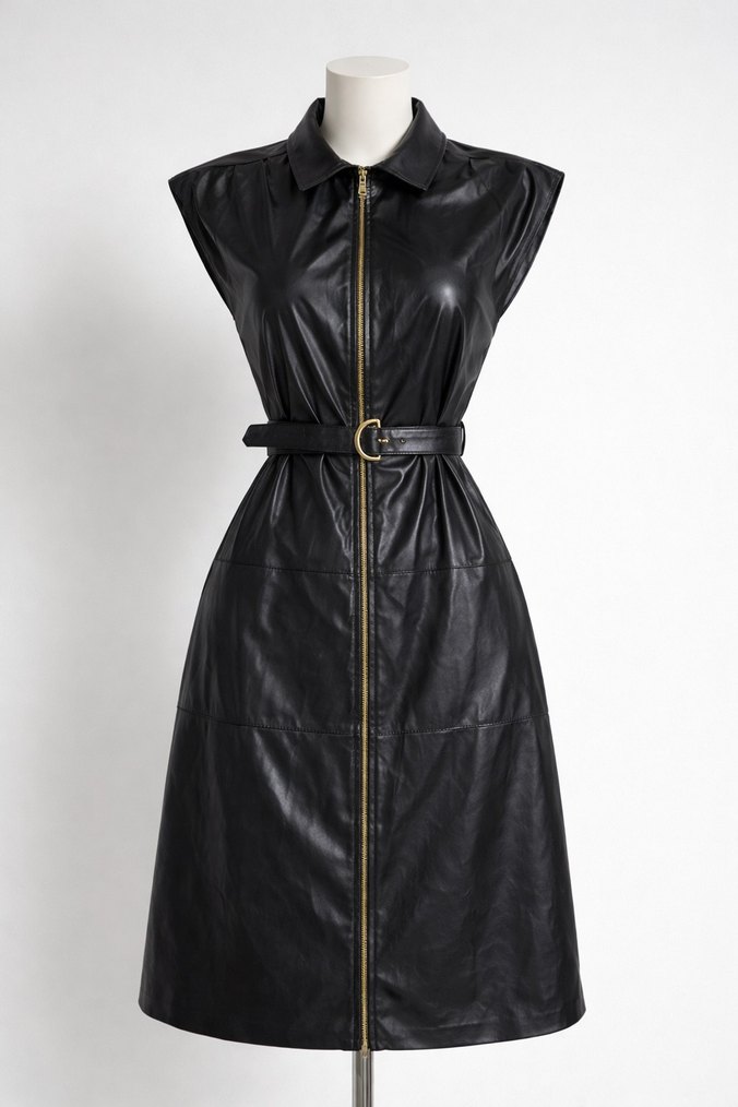 Diz altı deri Kemerli şık elbise.