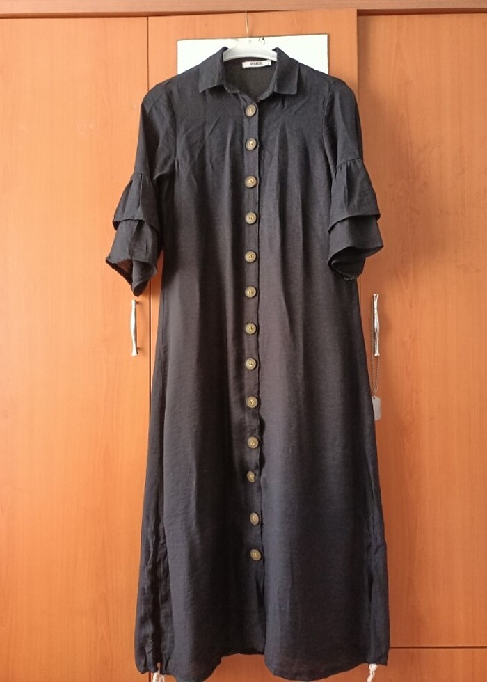 az kullanılmış yan yırtmaçlı düğmeli kolları fırfırlı keten gibi kumaşı yazlık rahat gömlek elbise