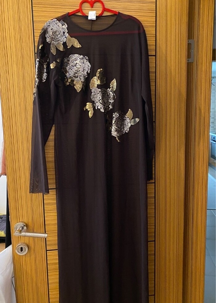 Kahverengi uzun Tül elbise hiç kullanılmadı yakası pul işlemeli içliği yoktur.