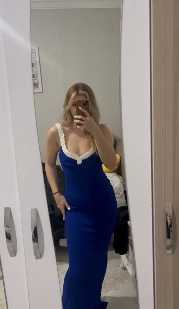 Mavi denim kumaştan, beyaz detaylı V yakalı ve kolsuz, romantik akşamlar için şık ve iddialı midi elbise.