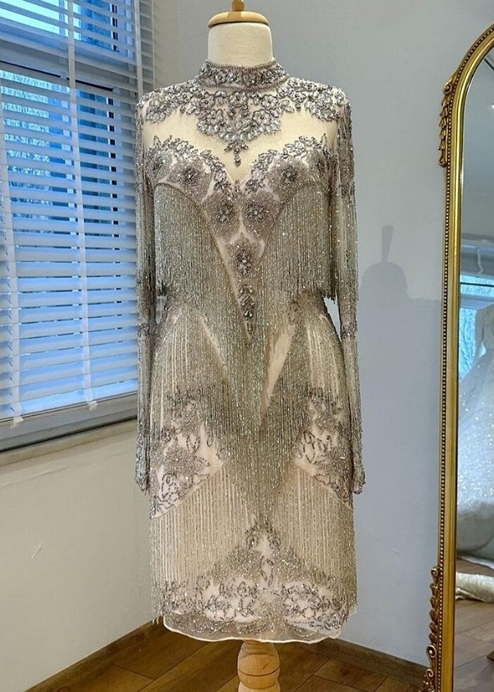 Elbiseyi after partide 1 saatliğine giydim. Elbise tamamen boncuk ve çok gösterişli bir elbise , çok severek giydim.