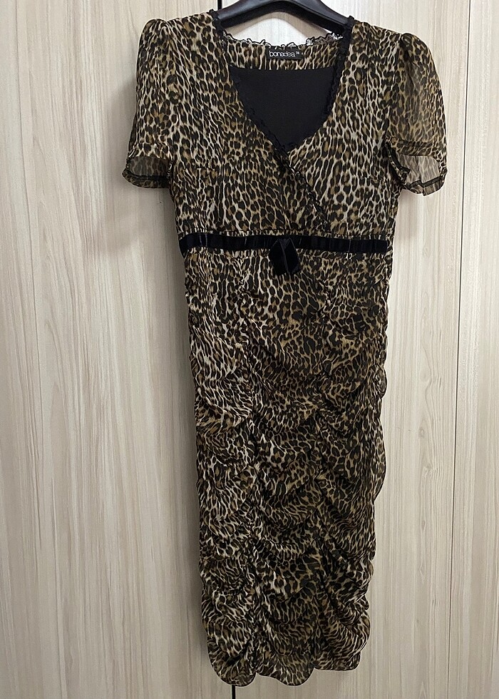 Leopar desenli şık dar elbise. Davetlerde kullanılabilir.