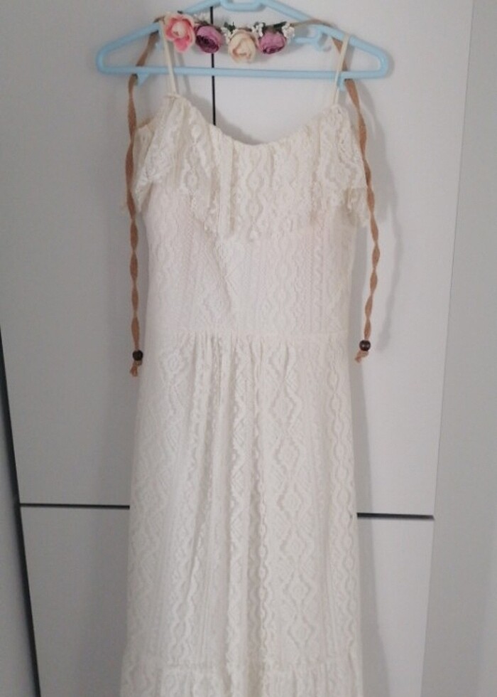 1 defa oğlumun sünnetinde giydim. 40 beden yazıyor fakat 38 bedene uyumlu, 36 olan daraltabilir. Ekru renk, üzeri tül içi astarlı, çiçek kuşaklı