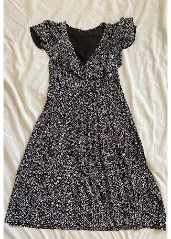 1-2 kez kullanılmıştır. V yaka , yaka kısmından başlayan volanlı kol detayı vardır. İç göstermez. Diz üstü elbise Standart beden