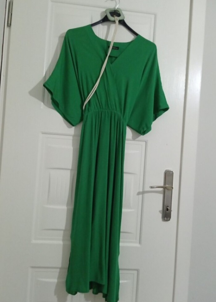 Kruvaze yaka.beli lastikli.ayrıca tokalı kemeri var.kısa kollu elbise