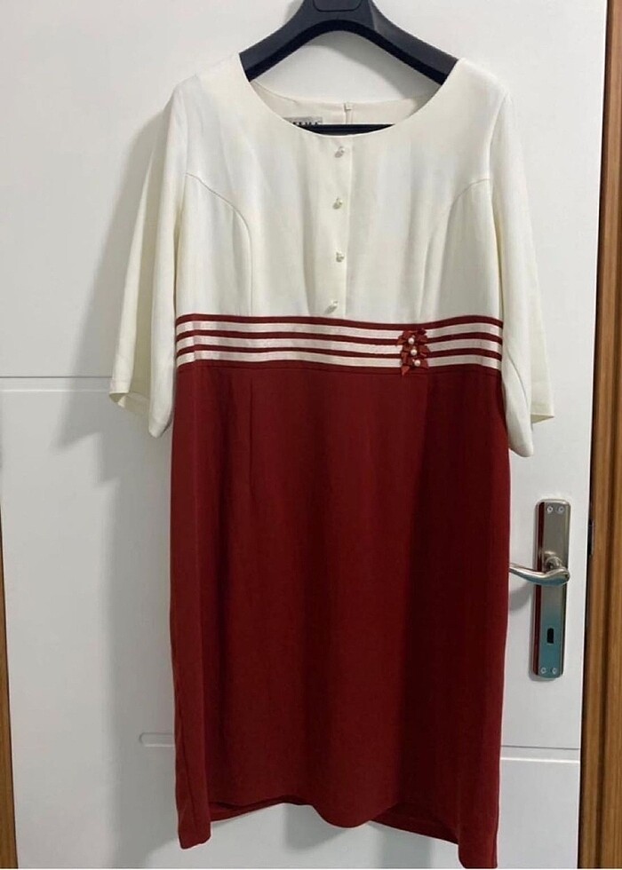 Sadece 1 kez kullanıldı temiz ve sorunsuz 44 beden ama 46 bedene kadar olur kumaşı esnek. Alt kısmı kiremit kırmızı üstü kırık beyaz