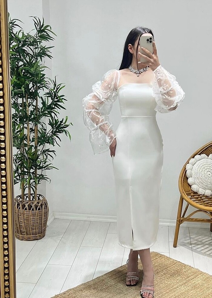 Yeni ve etiketlidir. Kolları tül ve inci kaplamadır. İç kısımda astar mevcuttur, iç gösterme yapmaz. Uzunluk 115 cm’dir. Rengi kırık beyaz kol rengi beyazdır.