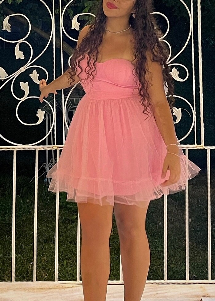 Toz pembe kabarık mini elbise. 2 kere giydim , elbise L beden, boyum 1.64.